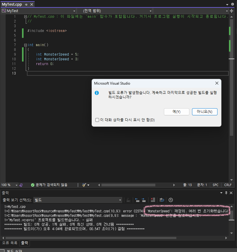 C2374 'MonsterSpeed': 재정의. 여러 번 초기화했습니다.