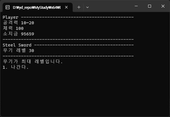 Weapon 클래스가 생겼다. Player가 무기를 가질 수 있고 이제 랜덤한 기본 공격력에 무기 공격력이 더해져서 계산된다. Town이라는 마을이 생겼고 마을에서 무기 강화와 힐을 할 수 있는 공간이 생겼다.