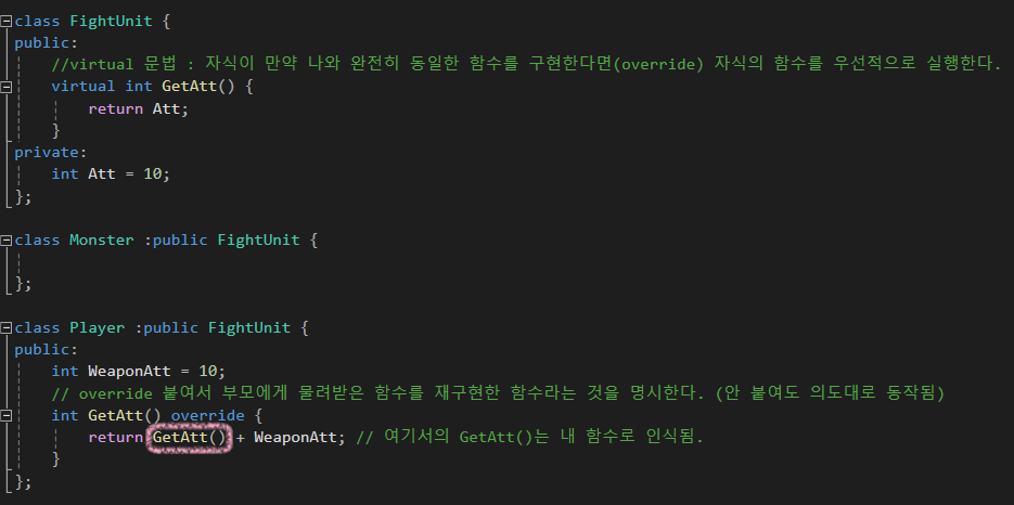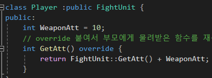 return FightUnit::GetAtt() + WeaponAtt; // 여기서의 GetAtt()는 내 함수로 인식됨.