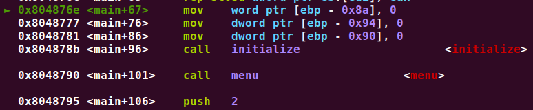main+67에서는 ebp-0x8a 주소에 2바이트가 할당된다. (char select[2])