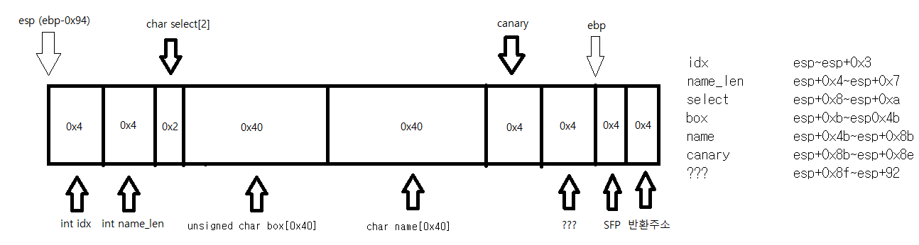이를 이용해 카나리 값을 구한다.box를 0~63 이라고 하면 name은 64~127이고 canary는 128~131이다.