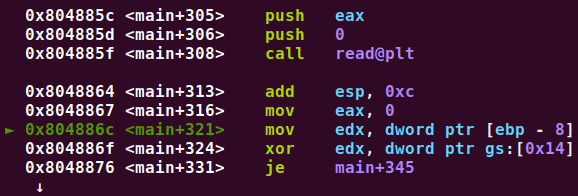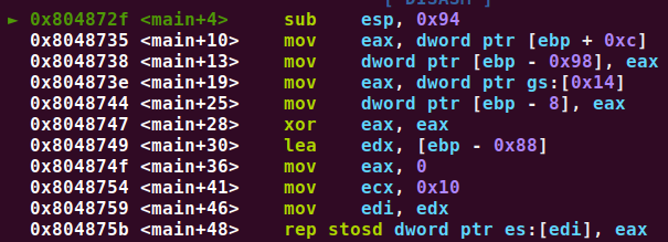 gs:[0x14]를eax에 대입하고, 그eax를ebp-8에 대입하는데,