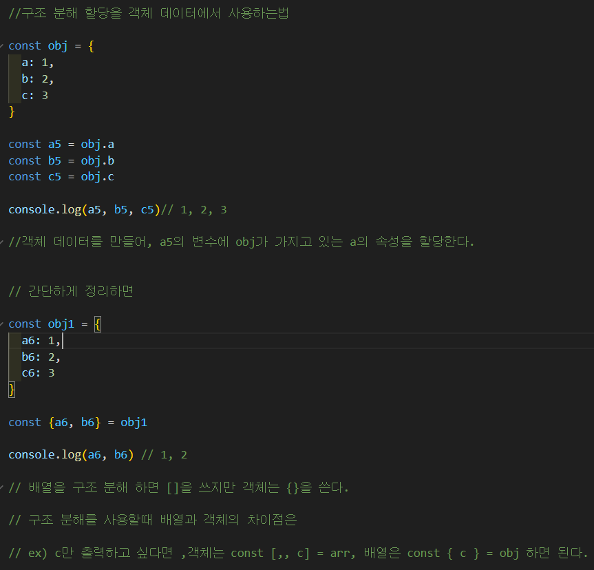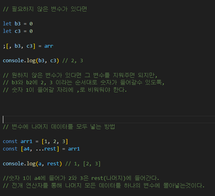 구조 분해 할당자를 사용할때 필요없는 변수가 있는 경우 사용법 과 모든 데이터를 하나의 변수에 넣는 방법