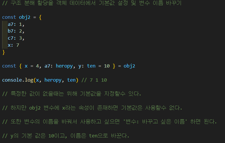구조 분해 할당을 객체 데이터에서 기본값 설정 및 변수 이름 바꾸기