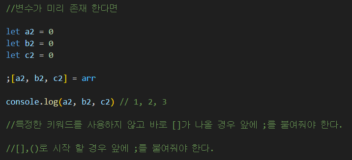 구조 분해 할당자를 사용할때 변수가 미리 있는 경우 사용법