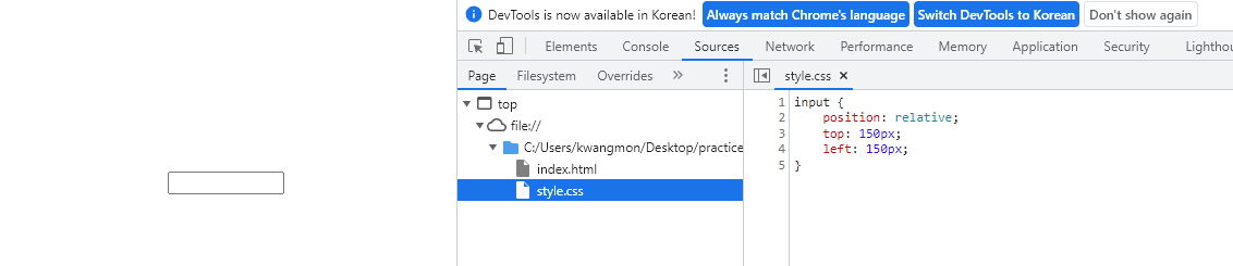ㆍ 자신이 배치되어있던 위치에서 top: 150px; left:150px; 만큼 위치가 조절되는 것을 볼 수 있다. position도 relative임을 확인할 수 있다.