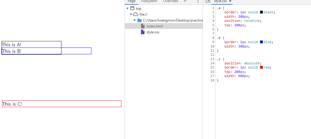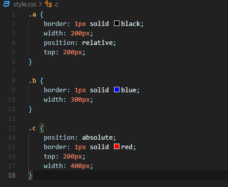 ㆍ a는 relative position이므로 기본값에서 top:200px; 떨어진 위치에 위치한 것을 볼 수 있고 b는 static position이므로 일반적 흐름에따라 배치되었고 c는 absolute position이므로 relative position을 가지고 있는 가장 가까운 부모인 a를 기준으로 top:200px; 떨어진 곳에 위치한 것을 볼 수 있다.