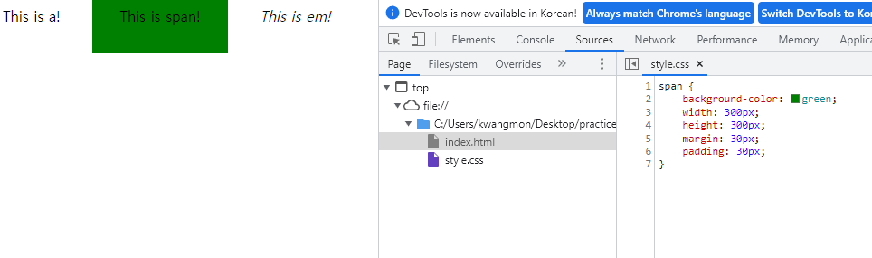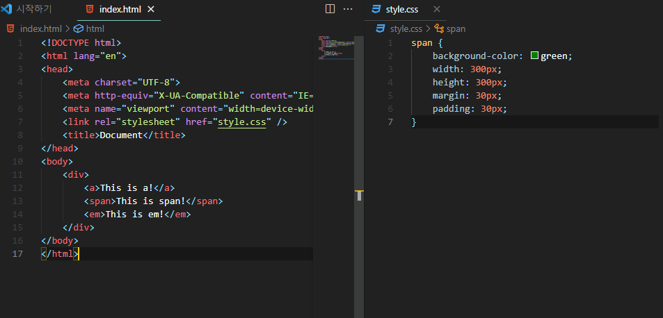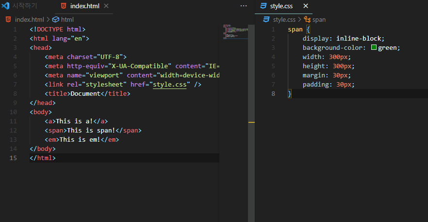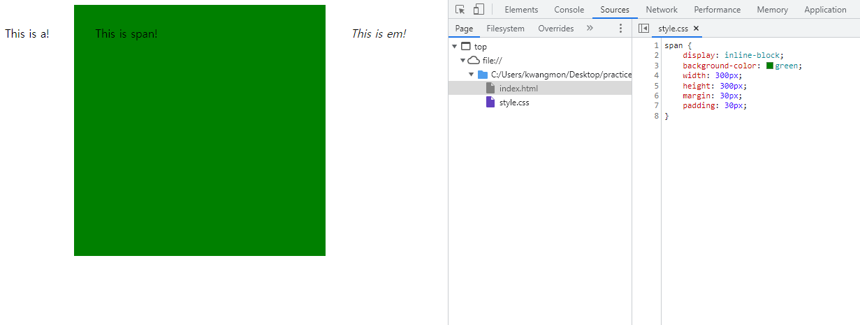 ㆍ display 속성이 inline으로 지정된 element는 전후 줄바꿈 없이 한 줄에 다른 element들과 나란히 배치된다. 대표적인 inline element로 span이나 a, em 태그 등이 있다.