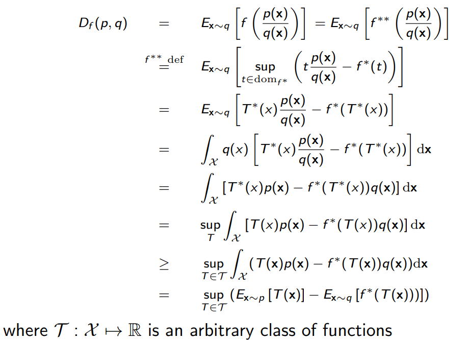 - lower bound: Df(p,q)=≥T∈Tsup(Ex∼p[T(x)]−Ex∼q[f∗(T(x))])