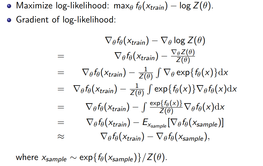 - pθ(x)=∫exp(fθ(x))dx1exp(fθ(x))=Z(θ)1exp(fθ(x)), Z(θ)=∫exp(fθ(x))dx