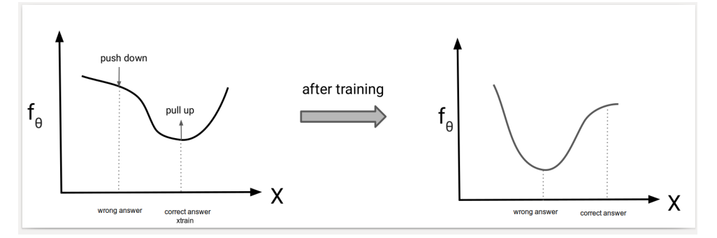 Energy-based model의 training 목표는 Z(θ)exp{fθ(xtrain)}의 최대화 이다. (maximum likelihood) 최대화 방향은, 식의 분자를 크게 만들고 분모를 작게 만드는 방향이다. 직관적으로 model fθ는 xtrain에 대해 높은 값을 가져야 한다. 그러나 θ를 단순히 fθ(xtrain)을 높이는 방향으로 학습하는 것이 xtrain이 다른 sample에 비해 상대적으로 높은 probability를 갖도록 하지는 못한다. 왜냐하면 fθ 는 normalize 되어있지 않기 때문이다. 따라서 학습은 xtrain 의 fθ 값을 높이고 나머지 다른 sample들 (xsample)의 fθ 값을 낮추 도록 학습 되어야 한다. 즉, wrong point에 대한 fθ의 값은 push down을 하고 correct point에 대한 fθ의 값은 pull up을 시켜야 한다.