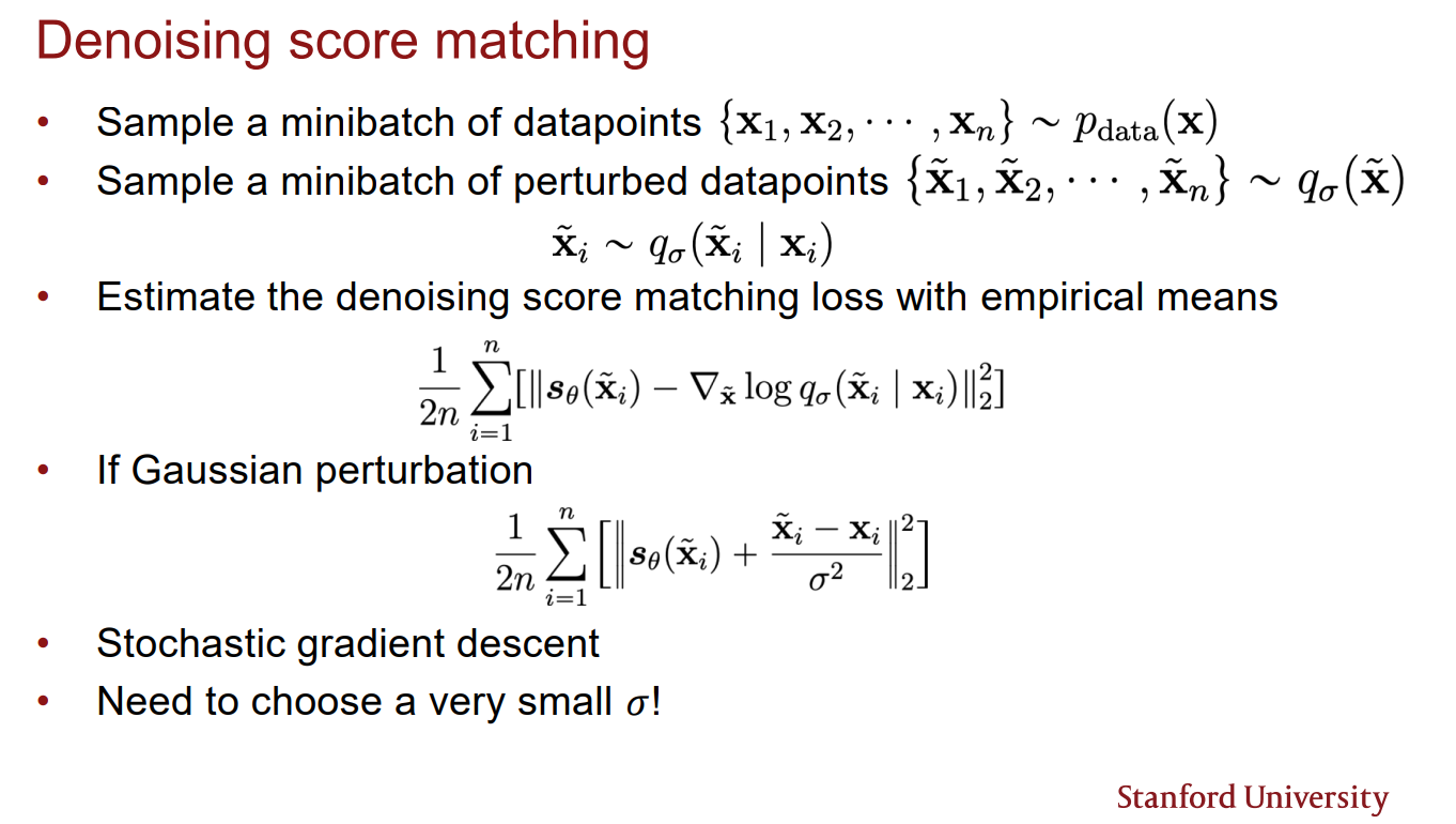 Denosing score matching은 score estimation이 비교적 쉽지만 noise가 끼지 않은 data에 대한 score estimation을 할 수 없다는 단점이 있다.