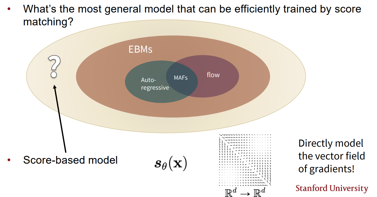기존 Auto-regressive model과 Flow model이 likelihood를 바로 최적화 하여 modeling 하는 방식이었다면, Energe-based model에서는 partition function 문제를 해결하기 위해 pdf를 modeling하는 것인 아닌 score function 등을 modeling 하는 방식으로 generative models를 학습하였다. score-based models는 한 단계 더 나아가 score function 즉, gradients의 vector field를 직접 modeling 하는 generative model이다.