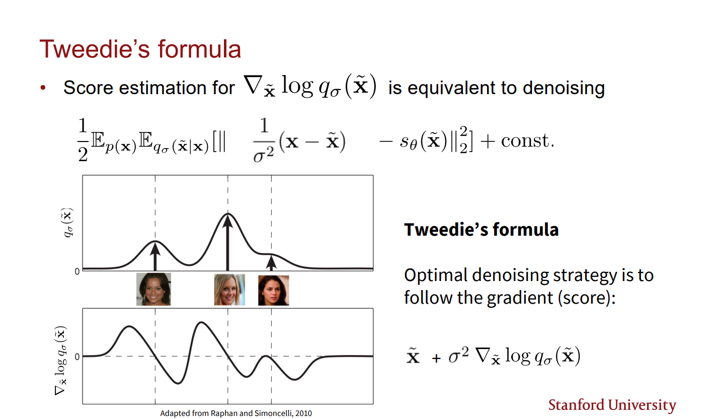 Denosing score mathcing의 학습 방식을 보면 nosing 된 distribution의 score를 matching 시키고 있을 뿐이다. 이는 왜 해당 방식이 denosing score mathcing이라 불리는지 이해하기 어렵다. Tweedie's formula는 이에 대한 해답을 준다.