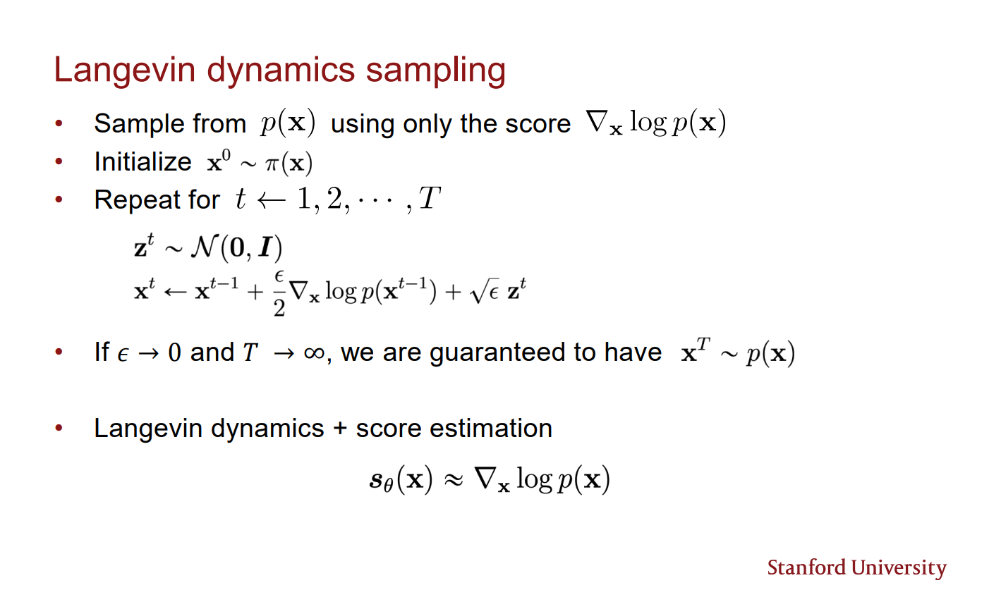 Score-based model의 sampling 은 MCMC 방식을 이용하여 sampling 할 수 있다. 다음 MCMC의 일종인 Lagevin dynamics sampling 방식이다.