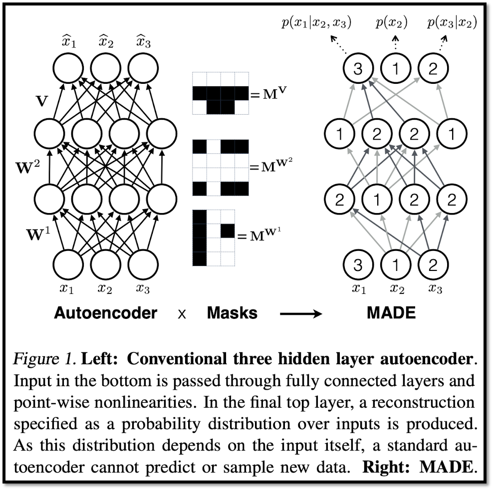 Autoencoder에 mask를 적용하면 autoregressive model 처럼 쓸 수 있다. autoregressive model 처럼 random variables에 ordering을 가정하고 영향을 미치는 random variables만 연산에 이용되도록 masking 처리를 한다.
