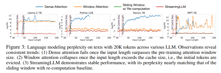 Dense attention의 경우 pre-tranied length를 넘어서면 성능이 저하되었고, window attention의 경우 cache size를 넘어서면 성능이 하락하였다. 반면 Streaming LLM의 경우 지속적으로 성능을 유지한 것을 확인 할 수 있다.