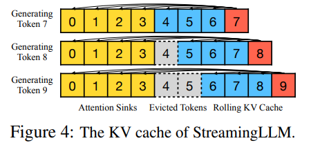 위 figure 4 처럼, attention sinks들은 항상 유지를 하고, 중간에 recent cache size를 넘어서는 token들을 버리고 새로운 token들을 caching하는, rolling 과정을 거친다. 이때 StreamingLLM은 caching된 data를 기준으로 relative position embedding을 다시 수행한다. 예를 들어 token 9을 생성하는 단계에서 caching된 데이터의 실제 position id는 [0, 1, 2, 3, 6, 7, 8] 이지만, [0, 1, 2, 3, 4, 5, 6, 7]을 가지고 relative position embedding을 사용한다. RoPE(Rotary Poisitonal Embedding)을 사용한다면, cache 이후 RoPE를 적용하는 방식으로 StreamingLLM을 구현할 수 있다.