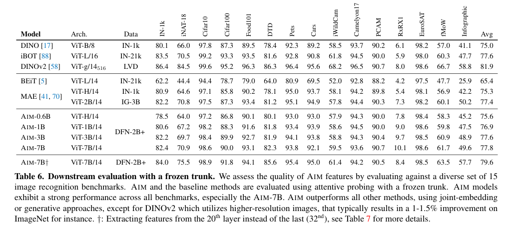 Pre-training head는 각 patch에 대해 독립적으로 loss를 계산한다. AIM은 global image token도 사용하지 않기 때문에 global image 정보는 거의 얻지 못한다. classification 같은 downstream task는 global image description이 필요하므로 논문에서는 global descriptor로 attention pooling을 이용하였다. 논문에서는 attention pooling을 Attentive Probe라고 부른다.