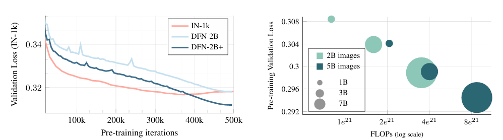 논문에서는 DFN dataset(12.8B images)을 base로 pre-training을 진행한다. DFN dataset은 image와 caption pair로 구성되어 있는데 alignment score를 통해 2B images를 sampling 한 dataset을 DFN-2B라고 한다. LLM pre-training에서 일반적으로 high-quality data를 oversampling 하여 pre-training을 진행한다. 이와 비슷하게 논문에서는 DFN-2B에서 0.8 비율로 sampling하고 ImageNet Dataset에서 나머지 0.2를 sampling 한 dataset DFN-2B+를 만들었다. 논문의 대부분 모델은 DFN-2B+로 pre-training을 진행하였다.