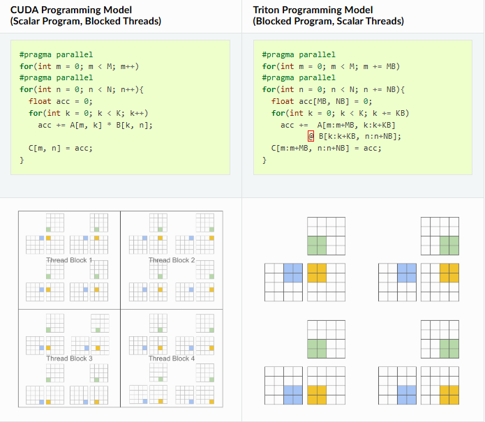 좀 더 실용적인 GPU programming을 위해 Triton은 blocked algorithms에 기반을둔 programming paradigms를 채택했다. 구체적으로 "Single Program, Multiple Data"(SPMD) excution model을 다시 분석하였고, threads가 아닌 bolcked된 programs을 제안한다. 다음은 matirx multiplication에 대한 CUDA programming과 Triton Programming의 차이를 보여준다.