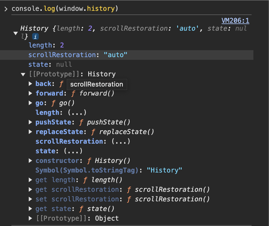 실제로, 브라우저 콘솔창에서 history를 찍어보면 아래와 같이 보여준다.