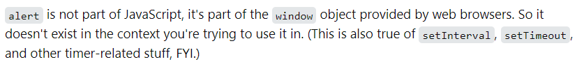 alert 메서드가 브라우저 환경 외부에서 사용될 때 발생한다.