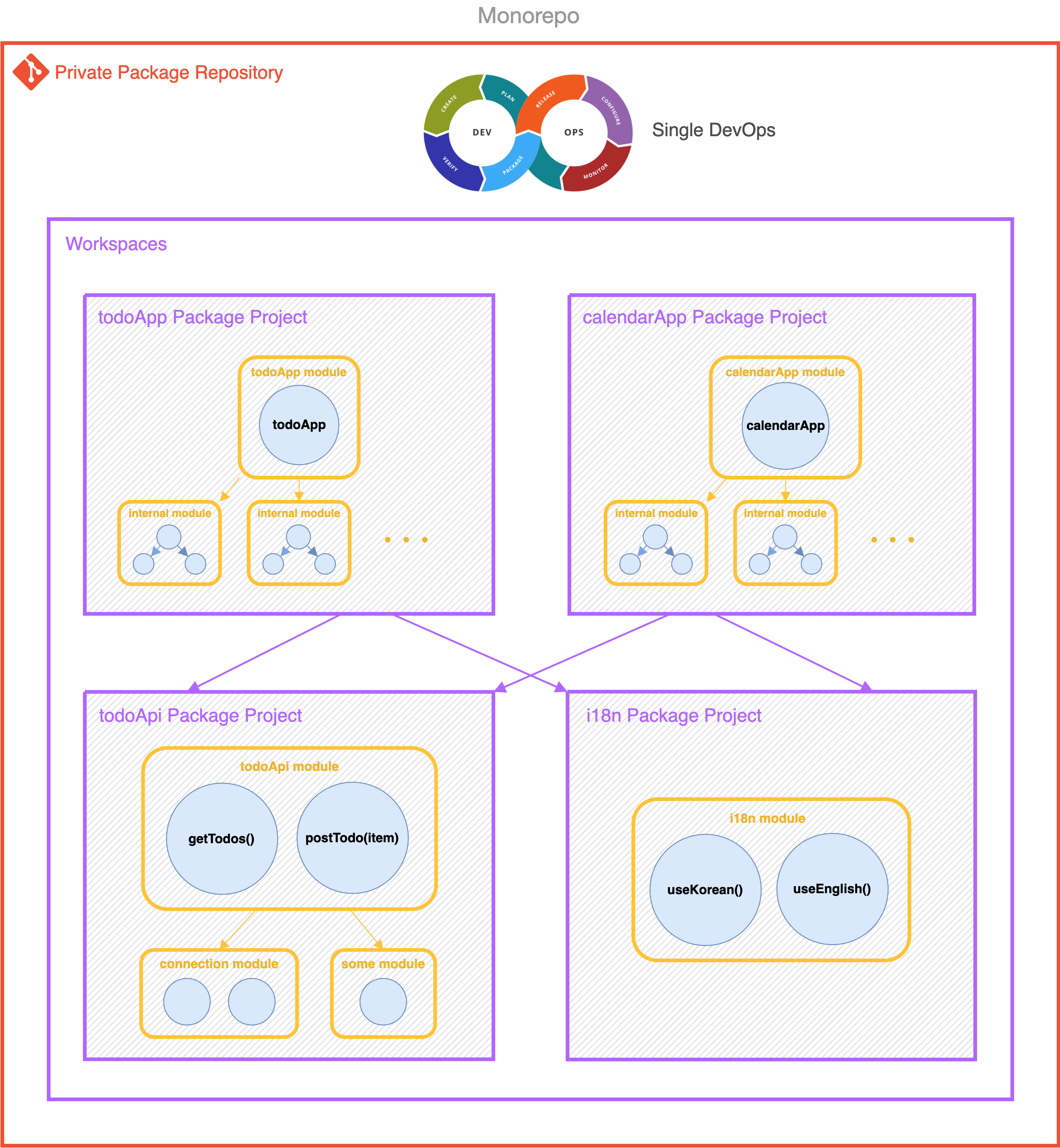 - 독립적으로 관리되는 모듈레포에서 코드중복 발생 (라이브러리관리 포함)