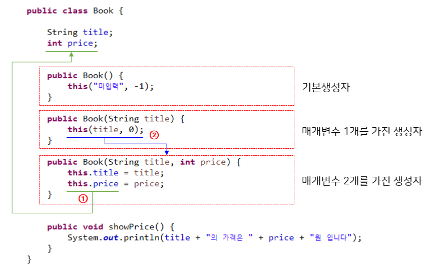 ② this( )는 생성자안에서 다른 생성자를 호출하므로, this(title, 0); 는 매개변수 2개를 가진 생성자를 호출하게 됩니다.