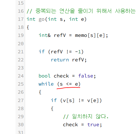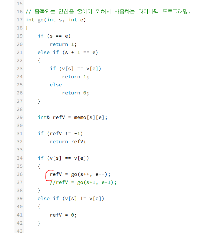 : 펠린드롬 확인하는 조건은 s <= e 인 경우에만 돌아야 한다.