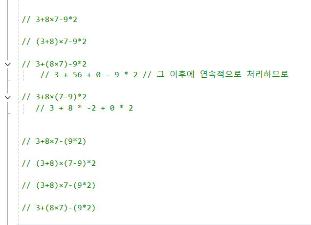 -> 괄호로 된거를 먼저 처리한 다음에 이후에는 전부 순서대로 하게 되므로 괄호 처리후 + 0으로 진행해도 무관하다.