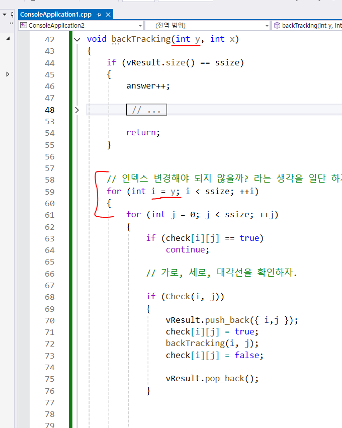 -> 어차피 백트래킹 호출할 때 y + 1 을 가지고 진행하기 때문에 세로를 for 돌릴 필요 없다!