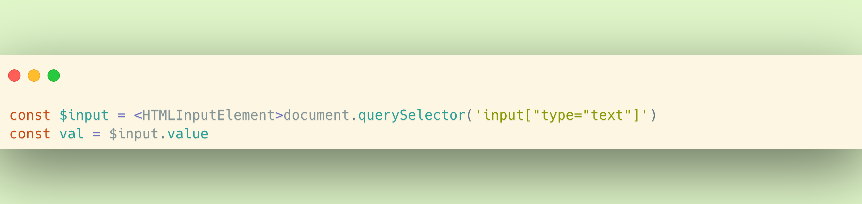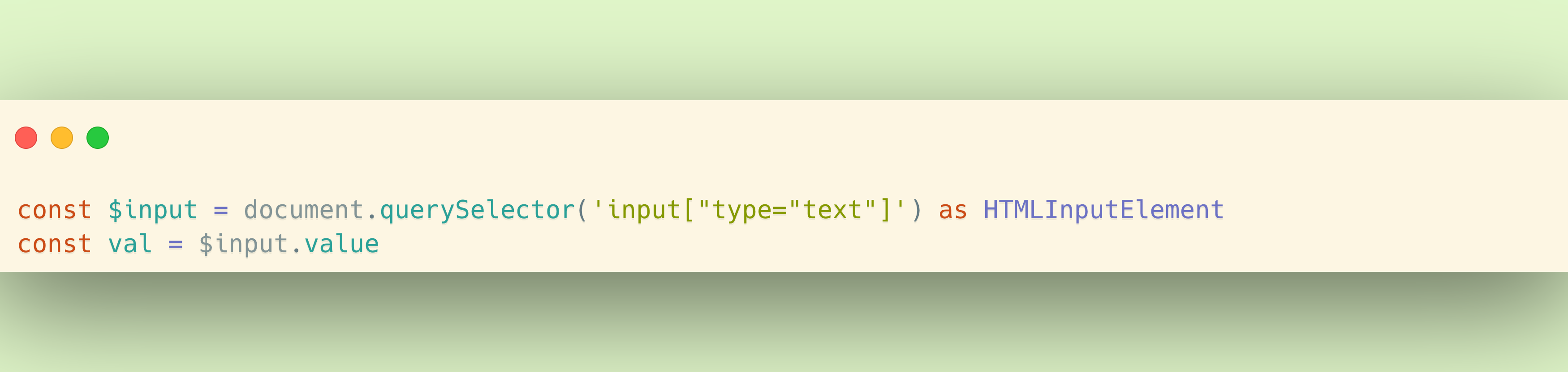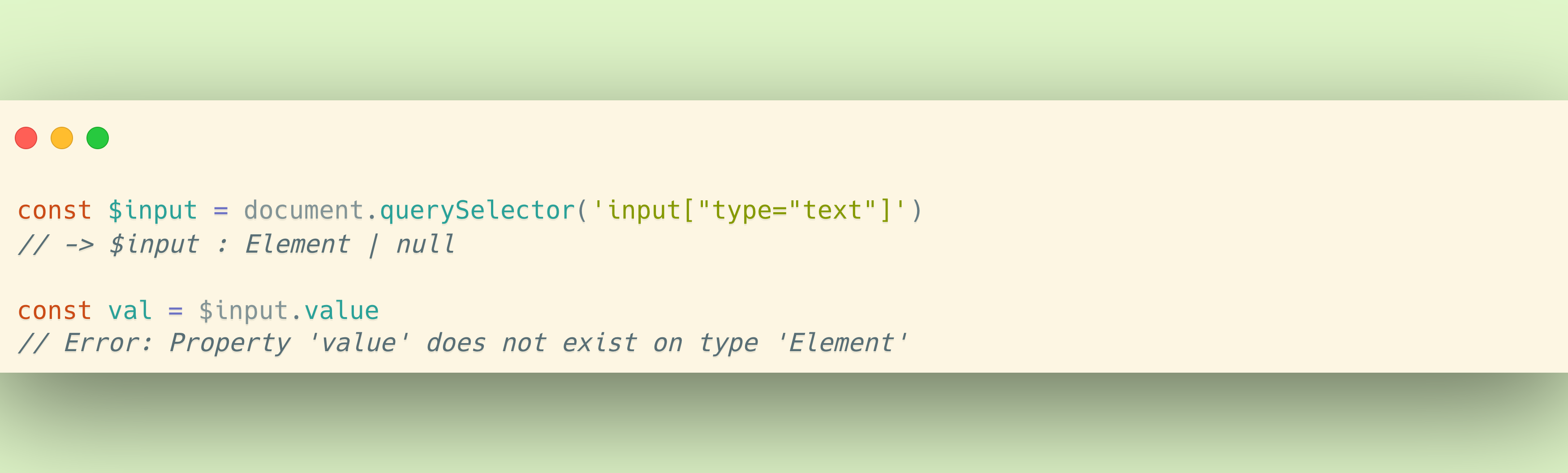 document.querySelector 메서드는 Element | null 타입의 값을 반환한다. 따라서 위 $input은 Element | null 타입이다. 이 때 $input.value를 실행하면 Element 또는 null 타입에는 value란 프로퍼티가 존재하지 않으므로 컴파일 에러가 발생한다.