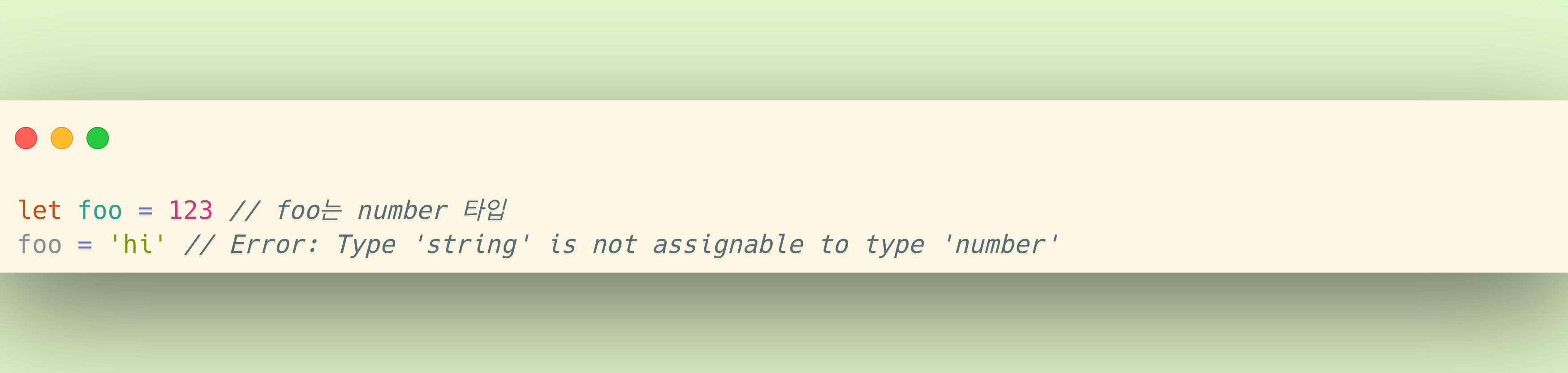 하지만 정적 타입 언어는 타입이 결정된 후에는 타입을 변경할 수 없다. TypeScript는 정적 타입 언어이므로 타입 추론으로 타입이 결정된 이후, 다른 타입의 값을 할당하면 에러가 발생한다.