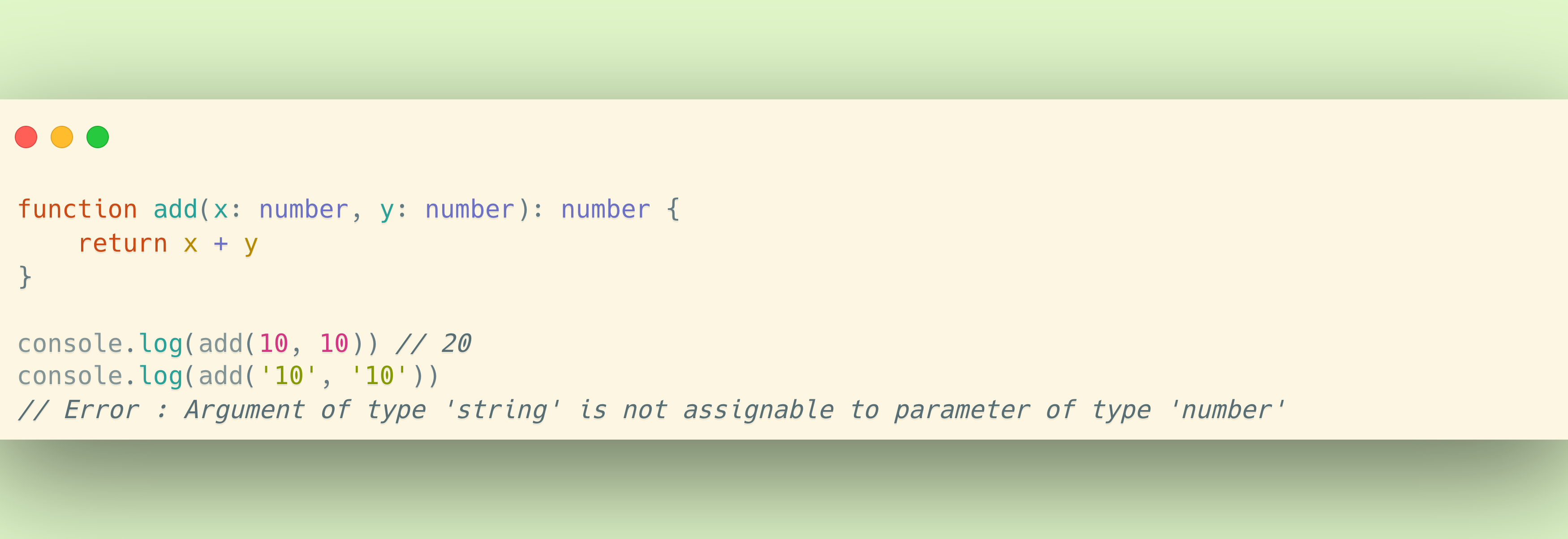 함수의 매개변수와 반환값에 대한 타입 선언 방법은 아래와 같다. 일반 변수와 마찬가지로 선언된 타입에 일치하지 않는 값이 주어지면 에러가 발생한다.
