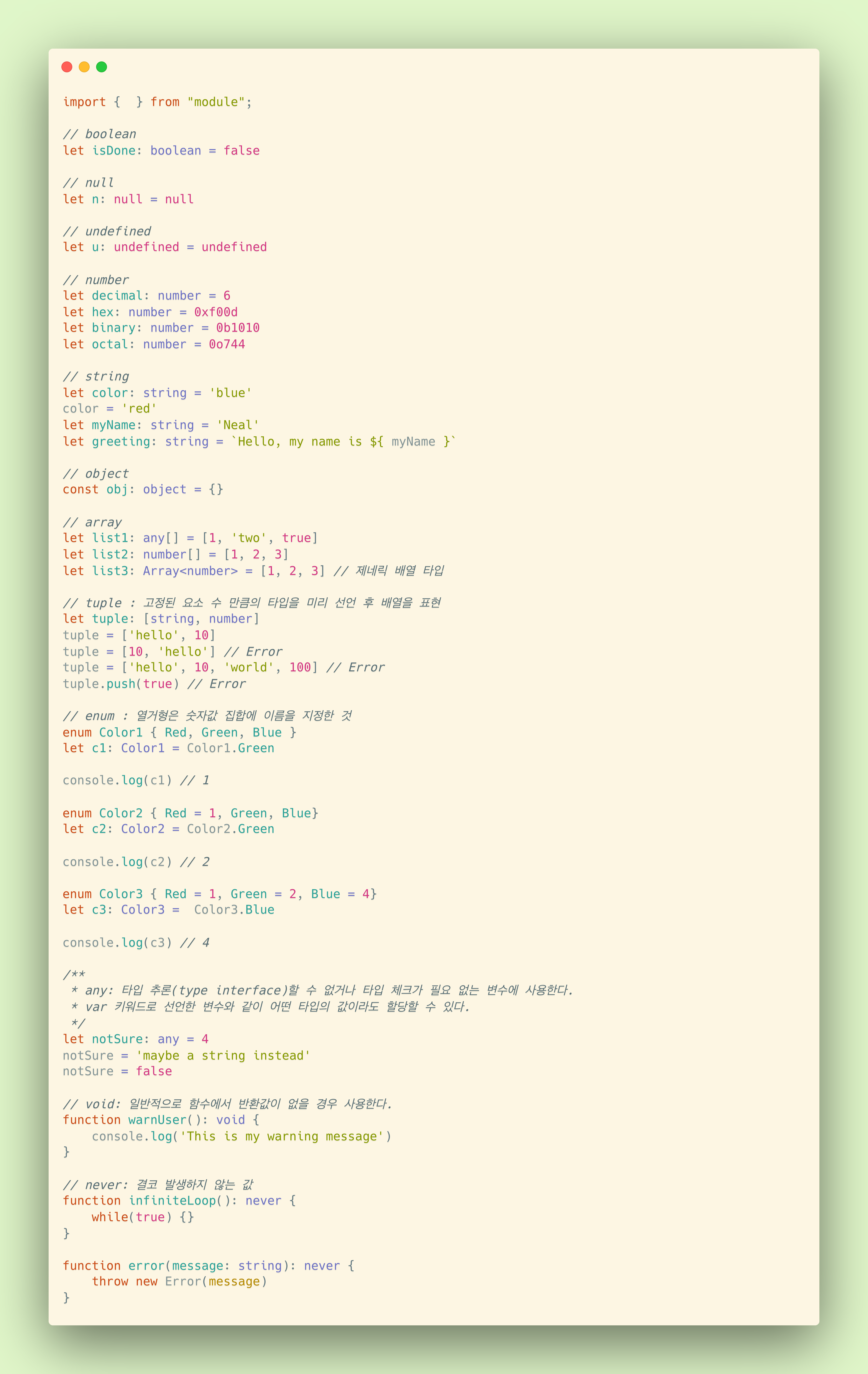 TypeScript는 ES5, ES6의 Superset(상위확장)이므로 자바스크립트의 타입을 그대로 사용할 수 있다. 이외에도 TypeScript 고유의 타입이 추가로 제공된다.