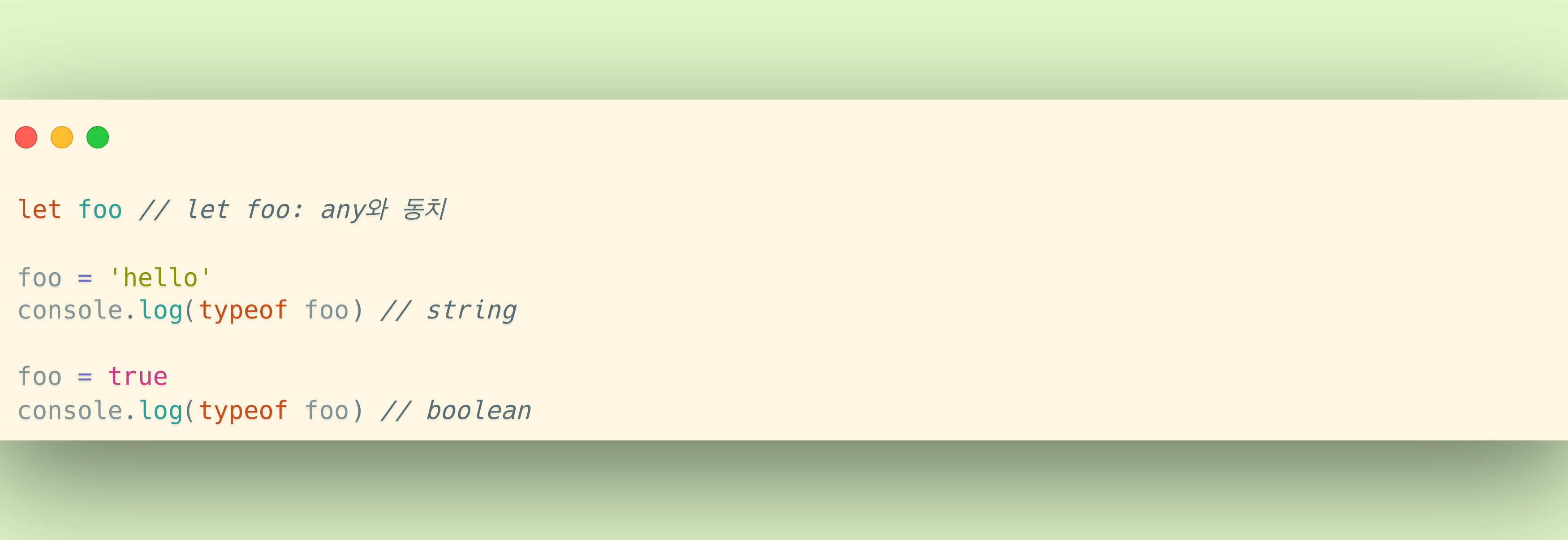 타입 선언을 생략하고 값도 할당하지 않아서 타입을 추론할 수 없으면 any 타입이 된다. any 타입의 변수는 자바스크립트의 var 키워드로 선언된 변수처럼 어떤 타입의 값도 재할당이 가능하다. 이는 TypeScript를 사용하는 장점을 없애기 때문에 사용하지 않는 편이 좋다.