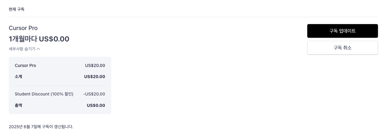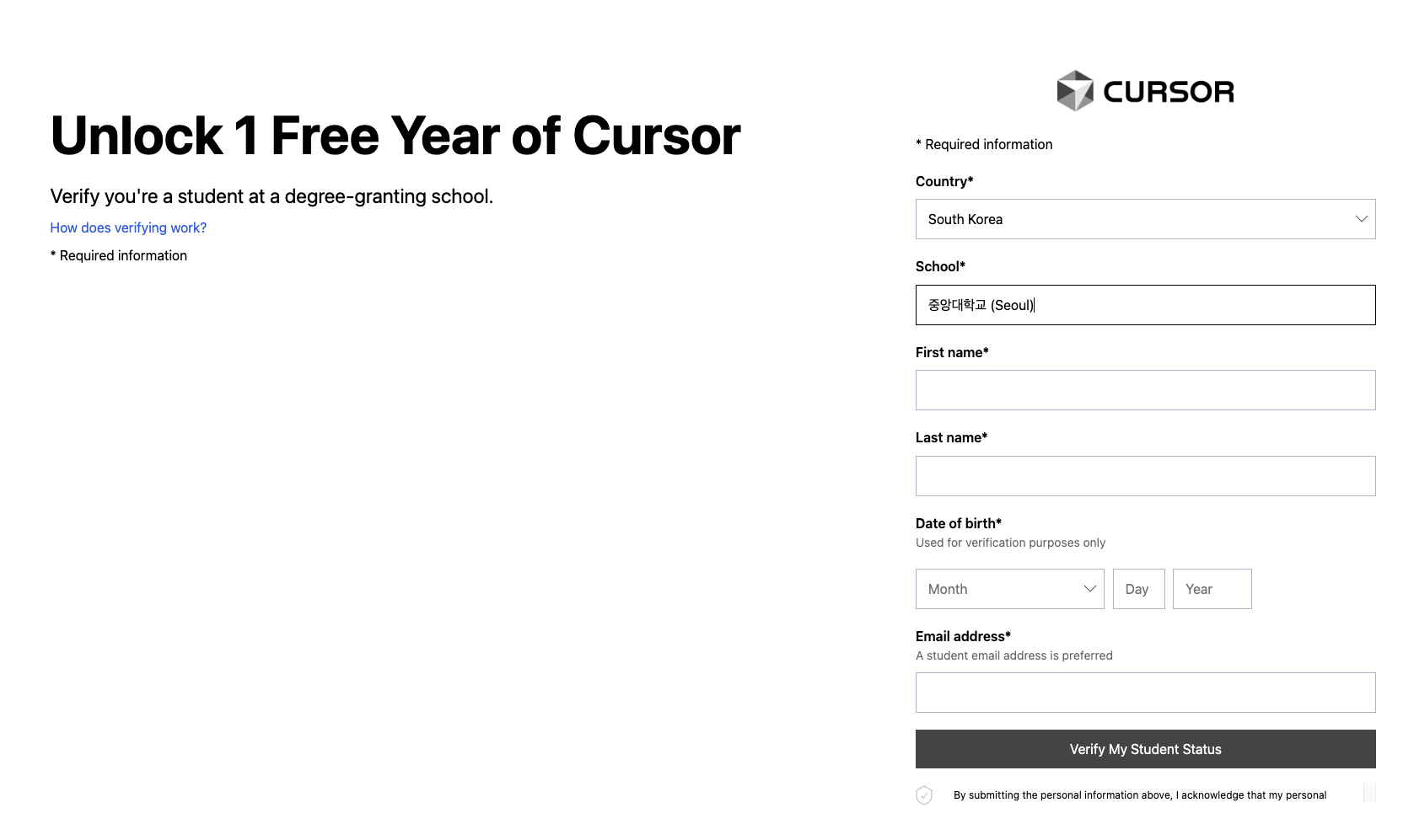 다만, JetBrains는 우리 학교 (중앙대학교) 가 등록이 안되어 있어서 GitHub Education이 없으면 오히려 짜증났는데, Cursor는 Microsoft 기반 인증으로 돌려서 금방 할 수 있었다.