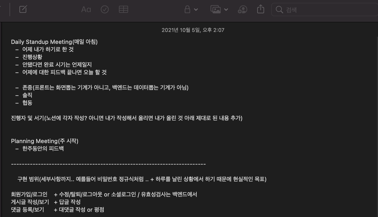 데일리 스탠드업 미팅에서 어떤 걸 해야하고, 팀원들과 지켜야할 약속에 대해 적고
