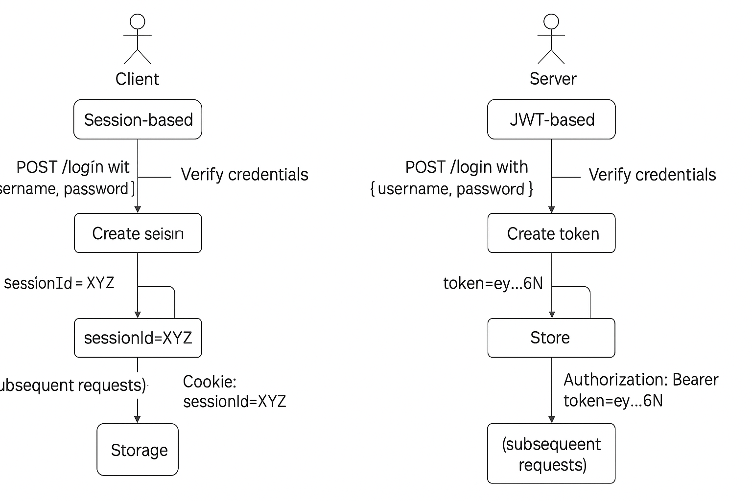 POST /login with {username, password}Set-Cookie: sessinId=XYZ; HttpOnly 응답Cookie: sessionId=XYZ 포함💡 비밀번호는 해시 (SHA-256, bcrypt 등)로 저장하고, 로그인 시 비교해야 안전합니다.