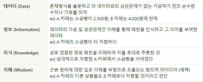 - 데이터(Data) : 개별 데이터 자체로는 의미가 중요하지 않은 객관적인 사실