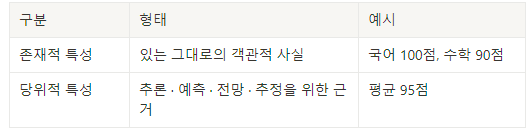데이터는 객관적 사실이라는 존재적 특성을 가지며 추론 · 예측 · 전망 · 추정을 위한 근거로 기능하는 당위적 특성