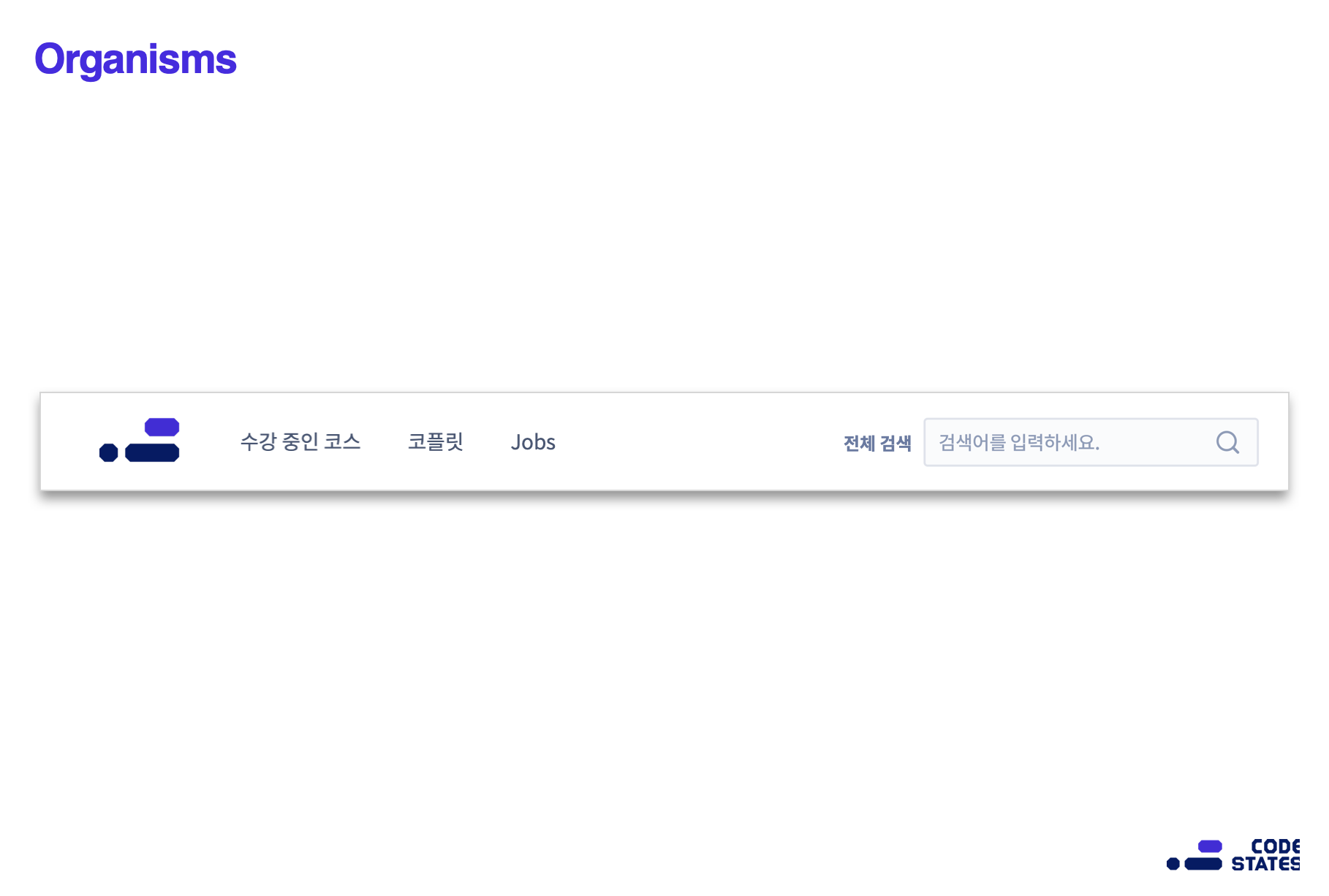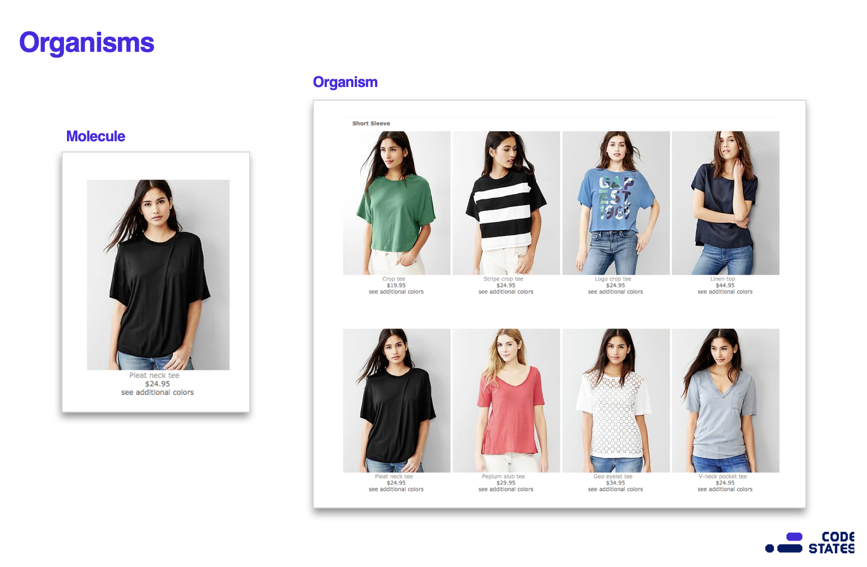 원자로 구성된 분자와 달리 유기체는 원자 및 분자 더 나아가 유기체로도 구성될 수 있는 조금 더 복잡한 UI구성 요소를 말한다.