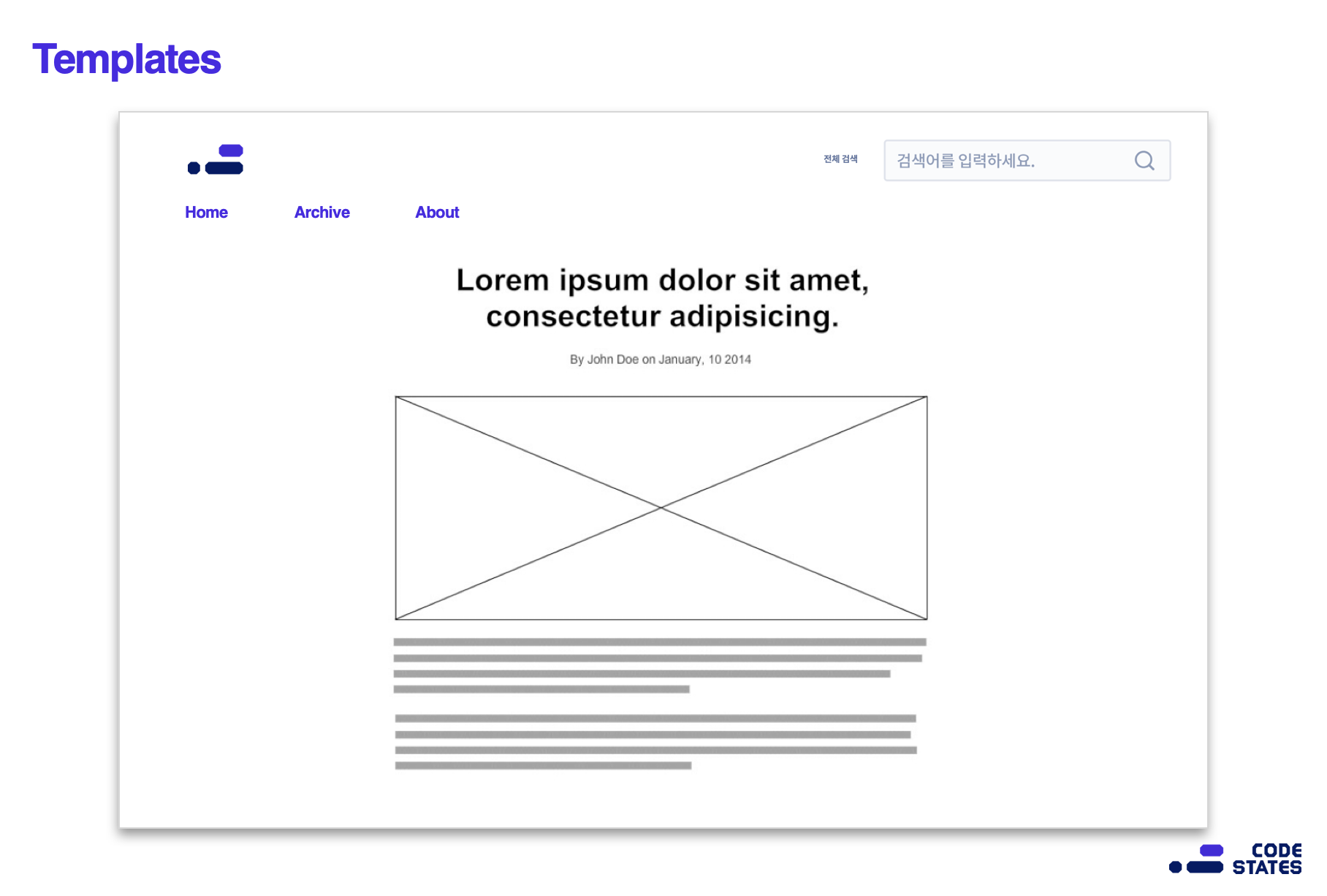 템플릿(Templates)은 페이지 레벨의 레이아웃을 구성하는 요소이다. 원자와 분자 그리고 유기체를 이용해 페이지에 들어갈 요소들을 만들었다면, 템플릿은 이러한 요소들의 배치와 페이지의 전체적인 구조를 정의해, 일관된 사용자 경험을 제공한다.