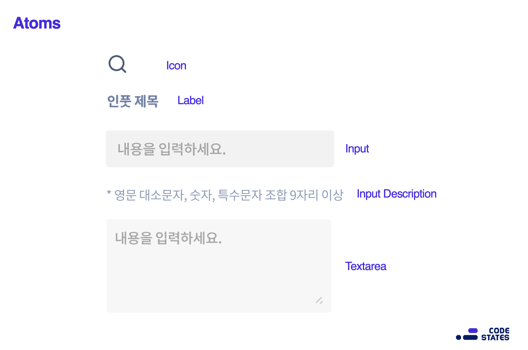 원자(Atoms)는 디자인의 가장 기본적이고, 더이상 쪼갤 수 없는 구성 요소를 의미한다.