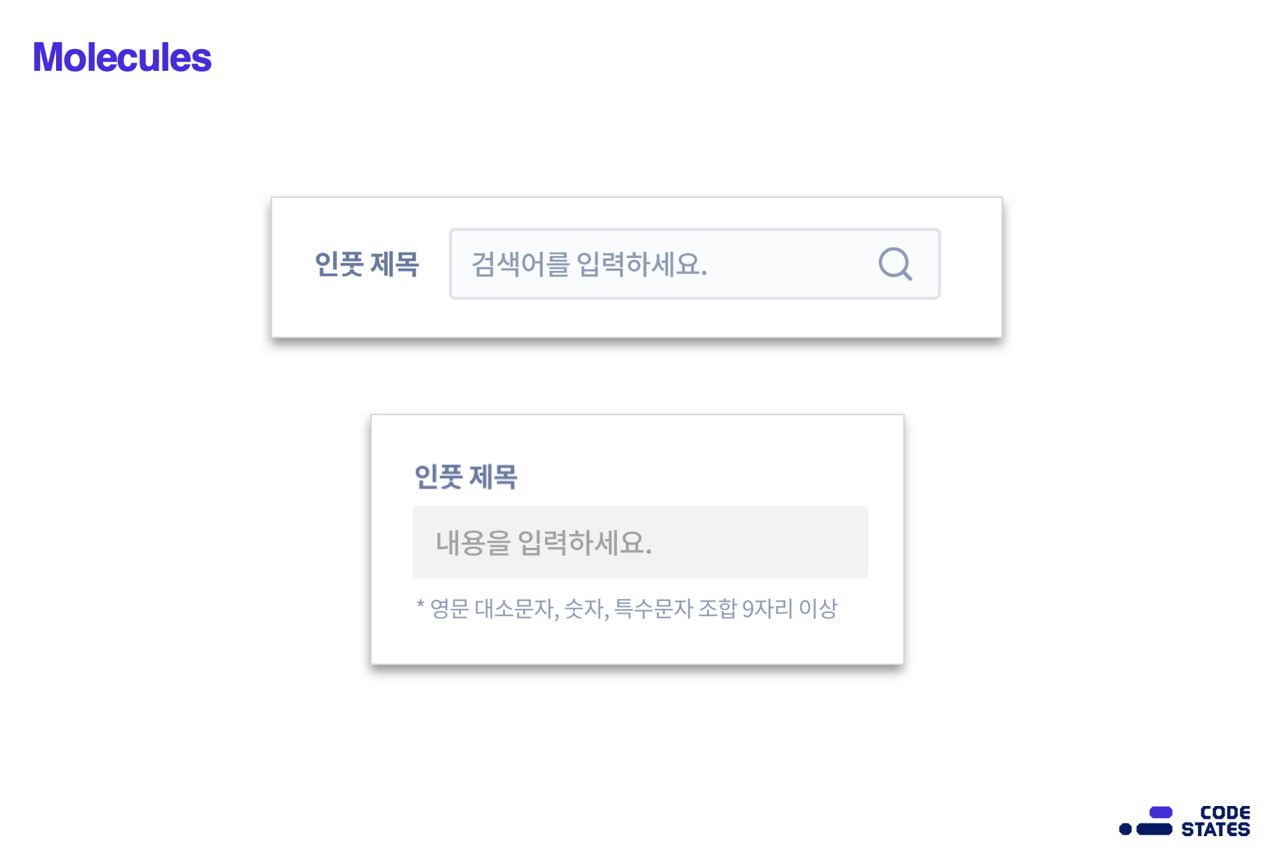 분자(Molecules)는 원자들이 모여 하나의 단위로 작동하는 UI의 집합을 말한다. 분자는 원자들이 결합하여 더 복잡한 구조를 이루는 중간 단계이다.