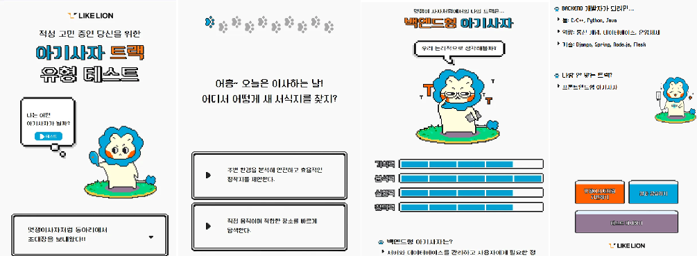 트랙 추천 테스트란 성격 유형 테스트에서 착안해, Yes/No 방식의 질문을 통해 사용자의 성향을 분석하고, 멋사의 네 가지 트랙(기획, 디자인, 프론트엔드, 백엔드) 중 가장 적합한 트랙을 추천해주는 서비스입니다. 이 테스트를 통해 멋사를 처음 접하는 학생들이 자신과 잘 맞는 트랙을 쉽게 이해하고, 동아리에 흥미를 가질 수 있도록 유도했습니다.