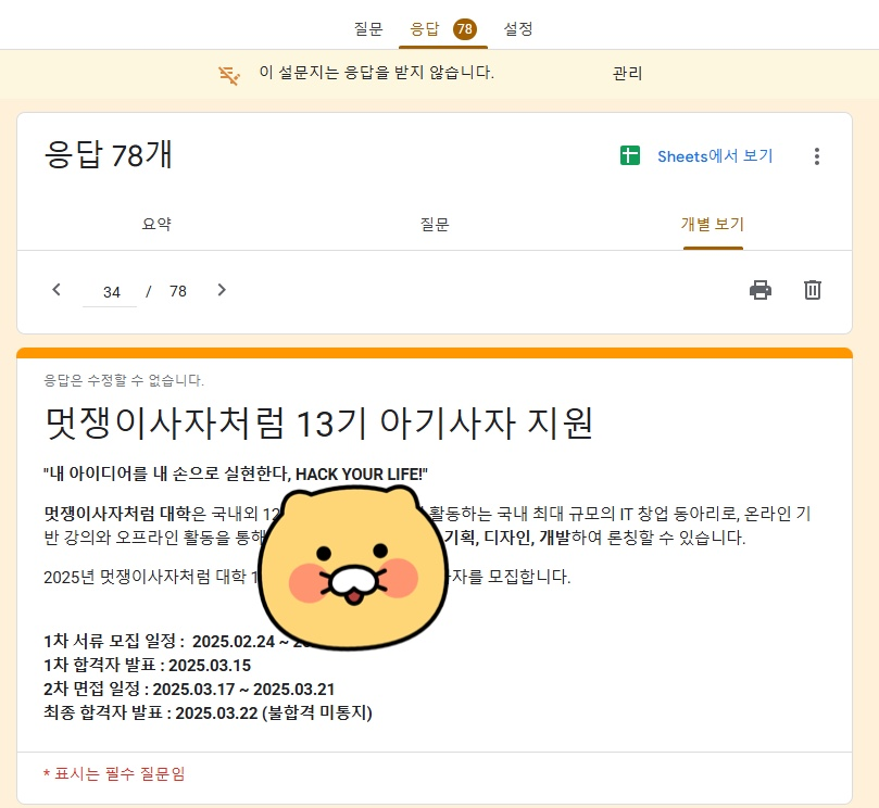 박람회 이후, 실제 지원자 수는 전년도 40명에서 올해 78명으로, 약 2배 가까이 증가했습니다. 이런 성과를 낼 수 있었던 이유는, 단순히 포스터나 온라인 공지에 의존하지 않고 실제 사용자가 직접 참여할 수 있는 트랙 추천 테스트 서비스를 활용했기 때문이라고 생각합니다. 또한 참여형 이벤트와 더불어 동아리에 대한 직접적인 설명과 소통을 통해 동아리에 대한 이해와 관심을 높였고, 그 결과 더 많은 학생들이 멋쟁이사자처럼에 지원할 수 있었던 것 같습니다.