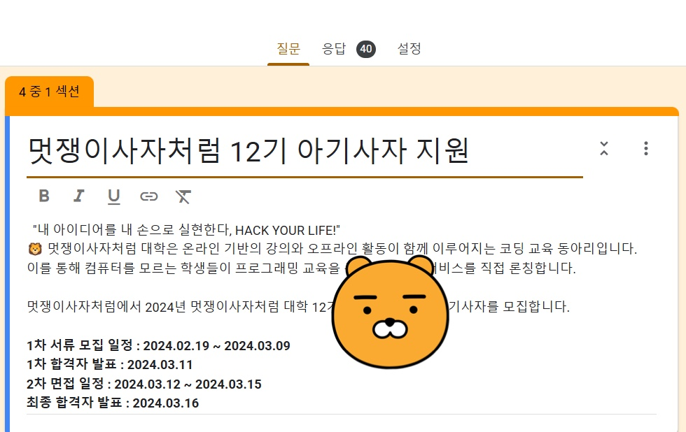 그러던 중 알게 된 것이 바로 '멋쟁이사자처럼'이었습니다. 전국 IT 창업 동아리로, 전국 여러 대학에 지부가 있고 교내에도 활동하고 있다는 사실을 알게 되었어요. 이곳에서라면 웹 개발에 관심 있는 사람들과 함께 성장할 수 있겠다는 확신이 들어 운영진에 도전하게 되었습니다.