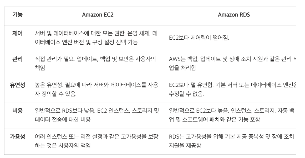 데이터 전송: 전송하는데이터의 양에 따라 비용이 달라질 수 있다. 보통은 RDS가 더 많은 데이터 전송 비용이 포함된다.
